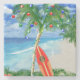 Herzlich willkommen an den warmen Sandstränden Ihres Lieblings-tropischen Inselstrands. Palmenbaum mit Weihnachtsschmuck und Lichtern, mit einem Retro-Surfbrett, das an den Weihnachtsbaum lehnt.