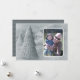 Foto eines handgefertigten Miniatur-Weihnachtsbaumes mit WEIHNACHTEN, das auf dem ganzen Set vor Schneefall gedruckt wurde. Diese Version ist cool blau. Laden Sie einfach Ihr eigenes Foto hoch und ändern Sie den personalisierten Gruß am Ende.