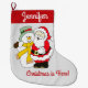 Der niedliche Cartoon Santa und sein Snowman-Freund. Rote Band an der Spitze des Strumpfs hat einen Platz, um den Namen in weißen Schriften anpassen. "Weihnachten ist hier!" steht in festlicher roter Schrift unter dem Bild. Alle Textfarben und Schriftart können auf Wunsch im Dropdown-Menü "Personalisieren" geändert werden. Verschiedene Größe und Stoffe sind verfügbar.