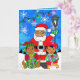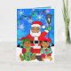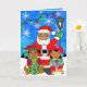Weiße Elfen und Weihnachtsmann, mit dunklerer Haut, um afroamerikanische Familien zu repräsentieren. Niedliche handgezeichnete Weihnachtsmann- und Elfenreisekarte, die durch das Hinzufügen von eigenen Namen und Urlaubsnachrichten innerhalb der Karte im personalisierbaren Bereich angepasst werden kann.