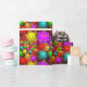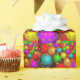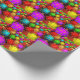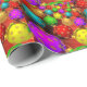 Weihnachts-Wrapping Paper mit glänzenden Weihnachtsbaumdekoren in lebhaften Farben von Gelb, Rot, Grün, Rosa und Türkis. Alle Designelemente werden gedruckt.