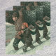 Vintage Illustration Frohe Weihnachtsbilder mit einem Mann und einem Jungen, der durch den Schnee geht. Der Vater trägt einen Tannenbaum, während das Kind die Axt oder das Luke trägt.