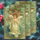 Vintage Darstellung religiöser Weihnachtsbilder mit einem Viktorianischen Engel mit einem großen Goldstar, heiligen Blätter und roten Beeren. Dieser Engelkirsch trägt ein fließendes Gewand mit Sternen. Weihnachtsgrüße.