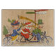 Vintage Abbildung Viktorianisch Era Frohe Weihnachtsbilder mit dem Weihnachtsmann sitzend im Zentrum eines dreifachen Tandemfahrrads mit zwei anderen Personen. Jeder trägt Hüte und windet. Die Schilder auf der altmodischen Lampe lauten "Viel Glück" "Good Heath" und "Good Cheer". Glückliche Feiertage und Grüße der Saison! Ho, ho, ho!