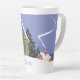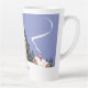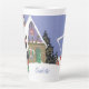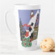 Leicht zu anpassen latte Tasse, fügen Sie einfach Ihren Namen! Vintage Abbildung Viktorianisch Frohe Weihnachtsbilder mit einem extravaganten Paar in eleganter Kleidung gekleidet und mit einem Geschenk oder Geschenk verpackt. Sie laufen durch den Schnee, um an einem Weihnachtsfest in einem Dorfhaus zu teilnehmen. Der Mann trägt einen Smoking und einen Top Hut und die Frau trägt warme Kleidung und hat einen Pelzmuff. Bäume umgeben die schneebedeckten Zuhause und Rauch kommt aus einem Kamin in der Ferne.