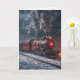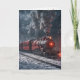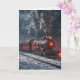Alte rote Dampflokomotive mit Dampfwolke und leuchtenden roten Lichtern in einem Schneesturm. Der Insider-Text kann geändert werden.