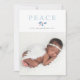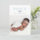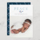 Weihnachtsfrieden in traditioneller Schrift, nicht säkulare Urlaubsfotokarte mit winterblauen Heiligenbäumen, Kiefernspießen und roten Beeren.