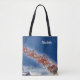 Einfach Tasche anpassen, einfach Ihren Namen hinzufügen! Vintage Illustration Frohe Weihnachtsbilder mit einem fröhlichen Weihnachtsmann mit seinem Rentier. Sie fliegen seinen Schlitten voll von Spielzeug durch den blauen Himmel und über eine schneebedeckte schlafende Stadt am Heiligabend im Winter. Ho, ho, ho Happy Holidays and Season's Greetings!