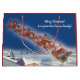 Einfach die Geschenktasche anpassen, einfach Ihre persönliche Nachricht hinzufügen! Vintage Illustration Frohe Weihnachtsbilder mit einem fröhlichen Weihnachtsmann mit seinem Rentier. Sie fliegen seinen Schlitten voll von Spielzeug durch den blauen Himmel und über eine schneebedeckte schlafende Stadt am Heiligabend im Winter. Ho, ho, ho Happy Holidays and Season's Greetings!