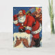 Vintage Illustration Frohe Weihnachtsfeiergestaltung mit einem fröhlichen Weihnachtsmann auf einem schneebedeckten Dach, der den Kamin mit einem Sack voller Spielsachen, verpackten Geschenken, Teddybären und Schlagzeug an Heiligabend hinunter klettert. Glückliche Feiertage und Grüße der Saison!