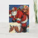 Vintage Illustration Frohe Weihnachtsfeiergestaltung mit einem fröhlichen Weihnachtsmann auf einem schneebedeckten Dach, der den Kamin mit einem Sack voller Spielsachen, verpackten Geschenken, Teddybären und Schlagzeug an Heiligabend hinunter klettert. Glückliche Feiertage und Grüße der Saison!