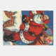 Vintage Illustration Frohe Weihnachtsfeiergestaltung mit einem fröhlichen Weihnachtsmann auf einem schneebedeckten Dach, der den Kamin mit einem Sack voller Spielsachen, verpackten Geschenken, Teddybären und Schlagzeug an Heiligabend hinunter klettert. Glückliche Feiertage und Grüße der Saison!
