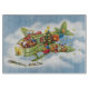 Vintage Illustration Frohe Weihnachtsreise und Transportdesign mit einem fröhlichen Weihnachtsmann, der ein altmodisches Propellerflugzeug im Himmel mit Elfen, Spielzeug, Puppen, Geschenkartikeln und einem Weihnachtsbaum auf dem Flügel fliegt. Sie fliegen das antike Flugzeug durch die flauschigen weißen Wolken und Sterne am blauen Himmel über ein niedliches, malerisches Dorf und einen schneebedeckten Wald in der Wintersaison.