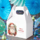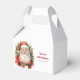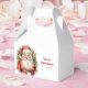 Eine winzige Gefälligkeitsbox mit einem niedlichen Vintagen Aquarellbild. Der Weihnachtsmann in seinem roten Anzug mit fröhlichen Wangen und einem lächelnden Gesicht. Umgeben von Kiefern und Heiligen.