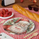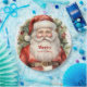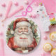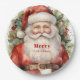 Papier Teller mit einem niedlichen Vintagen Stil Aquarellbild. Der Weihnachtsmann in seinem roten Anzug mit fröhlichen Wangen und einem lächelnden Gesicht. Umgeben von Kiefern und Heiligen.