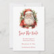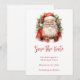 Save the Date Karte mit einem niedlichen Vintagen Stil Aquarellbild. Der Weihnachtsmann in seinem roten Anzug mit fröhlichen Wangen und einem lächelnden Gesicht. Umgeben von Kiefern und Heiligen.
