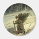 Vintage Illustration antikes Viktorianisch Frohe Weihnachtsgeschenk-Design mit einem alten Mann, der dem fröhlichen St. Nikolaus ähnelt. Er trägt einen Kiefernbaum durch den Wald während des Winters, der nur Fußspuren im Schnee verlasse.