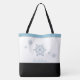Diese Tasche wird mit einem Bild eines blauen Schneeflockenmusters gezeigt. Schwarze Griffriemen, blaues Oberteil und schwarzer Boden über weißem Hintergrund mit hellgrauem Akzent Streifen. Text von Let It Snow in blau. Passen Sie dieses Objekt an oder kaufen Sie es wie geplant.