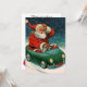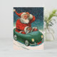 Einfach Weihnachts-Einladung anpassen, fügen Sie einfach Ihre Party-Details! Vintage Illustration Weihnachtsbild mit einem fröhlichen 50er Jahre Retro Santa Claus, der einen niedlichen grünen Cabrio im Schnee fährt! Auf dem Nummernschild steht Nordpol!
