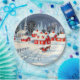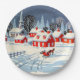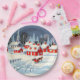 Hübsche Winterlandschaft mit roten Häusern und schneebedeckten Bäumen. Ein gezeichnet Schlitten gleitet auf dem Weg zur Kirche auf einer Landstraße.