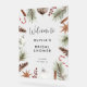 Feiern Sie die Braut mit diesem modernen Begrüßungsschild aus Brautparty-Acryl mit einem Weihnachtsrahmen in Aquarellfarbe mit Kiefernfüßen, Schmuckkerzen und Weihnachtsbeeren.