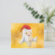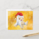 Eine niedliche und bezaubernde Illustration einer Weihnachts-Yeti-Puppe, die eine rote Weihnachtsmannmütze trägt. Das Kleine hat noch eine Pull-Kette, um ihn reden zu lassen, und er ist mit weich weißem Fell mit hellbraunen Akzenten bedeckt. Er sitzt herüber. Der Hintergrund ist ein festlich glitzerndes goldfarbenes Design.