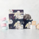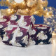 Christliches, thematisches Packpapier mit einem Muster. Entworfen mit einem süßen Engel mit gelben Flügeln, die einen Hirtenkräcker halten. Sitzen mit weißen, flauschigen Lämmern. Navy blauer und bordeauxfarbener Hintergrund, mit winzigen Flecken von Imitaten goldene Funkeln Glitzer (nicht wirklich Glitzer nur ein gedrucktes Bild).