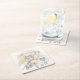 Papier Untersetzer mit einem zeichn eines süßen Engels mit gelben Flügeln, die eine Hirtenkrähe halten. Sitzen mit weißen, flauschigen Lämmern. Sehen Sie sich seine Herde an. Die weiche Aquarellfarbe zieht sich um das Bild herum. Set auf einem eggshell weißen Hintergrund.