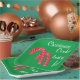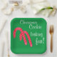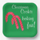 Weihnachts Cookie Baking Spaß geschrieben in weißer Schrift. Zwei rote und weiße gestreifte Süßspeisen. Festlicher grüner Hintergrund. Original Artwork © TamiraZDesign.