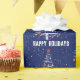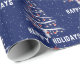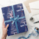 Happy Holidays weiße Weihnachtsbaum in Schneeflocken mit roten Socken und Baseballschmuck auf blauem Hintergrund. Die Hintergrundfarbe kann geändert werden.