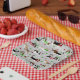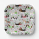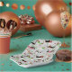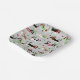 Niedliche Basset Hound Hunde mit braunen, schwarzen, weißen und Zitronencoats in festlichen Urlaubssoutiquen, Weihnachtsmannmützen und Raute Pullover mit verstreuten Weihnachtsschmuck.