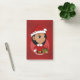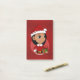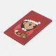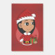 Design mit einer Illustration eines niedlich lächelnden glücklichen Mädchens mit langbraunem Haar, trägt sie ein rot-weißes Weihnachtskostüm und hält ein Geschenk; Weihnachtsfeiertage mit rotem Hintergrund