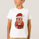 Der T - Shirt der Kinder mit einer Illustration eines niedlich lächelnden Hispanikers/Latinos mit kurzem schwarzem Haar trägt einen Weihnachtskostüm mit einem roten Hut und hält ein Geschenk; in einem roten Kreis auf weißem Hintergrund ein Weihnachtsferiendesign