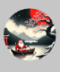 Dieser minimalistische T - Shirt zeigt eine ruhige japanische Winterlandschaft mit skurrilen Touchs wie Santa in einem Boot und einem Schneemann auf dem Mond, rot, schwarz und weiß dargestellt.