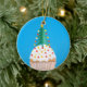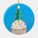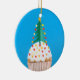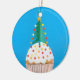 Ein Weihnachtsschmuck mit einem Kuchen auf jeder Seite. Der weiße Zuckerguss ist mit einem Christbaum geschmückt und stammt aus einer handbemalten Papierkollektion von Judy Adamson. Kaffee-Umschläge und Weihnachtskarten mit diesem Design auch erhältlich.
