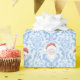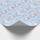 Dieses Weihnachtspapier hat ein blaues Damastmuster mit dem Weihnachtsmann in der Mitte.