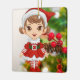 Ein fröhliches, belebtes Elfenmädchen mit braunem Haar und großen Augen, in festlichem Rot-Weiß-Outfit gekleidet, steht vor dem Hintergrund eines verzierten Weihnachtsbaumes. Der spielerische Ausdruck und die lebendige Kleidung der Elfen kontrastieren mit der weichen grünen Kiefer!