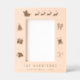 Ein maßgeschneiderter Laser-Holzrahmen, um Ihr beliebtes Foto zu Weihnachten in der Familie zu zeigen, mit Illustrationen vom Santa Fliegen in seinem Schlitten mit Rentieren, einem Weihnachtsbaum, Geschenken und Bogen, Bonbons und einer Weihnachtsmannmütze. Personalisieren Sie mit Ihrem Nachnamen und einer weiteren Textzeile in einfacher moderner Typografie.