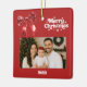 Roter Hintergrund, weißer Text und roter Bogen. Text und Foto. Frohe Weihnachten ist mit einem Retro-Schriftart geschrieben.