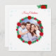 Niedliches modernes Foto, Kiefernkranz mit Poinsettias und Schneeflocken Weihnachtsgrußkarte. Text bereit, um personalisiert zu sein.
