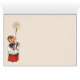 Weihnachts Grußkarte inspiriert durch eine fröhliche Vintage Farbe zeichnend. Das Bild zeigt vier singende Chöre, zwei davon halten ein Musikbuch, die anderen zwei mit gigantischen Kerzen. Im Hintergrund befindet sich ein Kronleuchter mit einem weiteren Paar überdimensionaler Kerzen und ein gewölbtes Fenster mit Kathedrale mit dekorativen Details. Viele Details des Bildes werden durch die Farbe des alten Goldes ergänzt, wie zum Beispiel das Kirchenfenster, die einfachen Sterne im Hintergrund, das Glanz der Kerzen und die Beschneidung der Kinderoutfits. Das Bild ist in einem charmanten Cartoon-Stil gestaltet. Einer der Chorknaben taucht wieder auf und erweitert die Weihnachtsatmosphäre auf die Innenseite der Unterseite.
