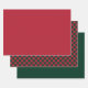 Das Verpackungspapier hat ein traditionelles rotes und grünes Farbschema. Ein Blatt hat eine solide Farbe rot. Eine andere ist eine solide Farbe dunkelgrün. Ein Blatt hat die klassische Weihnachtsfarbenpalette in einem Schachbrettmuster.