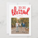 Selig Weihnachts-Handbrief Fotokarte. Rot, weiß, hell und glücklich. Sei gesegnet Weihnachten in phantastischer Handschrift. Eine schöne, helle Karte mit einem schönen Muster-Backer.