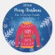 Ein Aufkleber für eine lustige Urlaubssaison und Weihnachtsvorlieben und Geschenke. Ein blauer Hintergrund mit großen weißen Schneeflocken, Kristallen. Die Dekoration ist mit einem üppig roten, weißen, orangen und grünen Weihnachtspulli verziert. Personalisieren und fügen Sie Ihren Familiennamen und das Jahr hinzu. Der Text: Frohe Weihnachten ist in Weiß geschrieben mit einem modernen handgeschriebenen Stil Skript. Weiße Buchstaben.