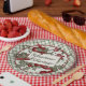 -Weihnachts-Holly-CHRISTMAS-BLESSINGS Weihnachtsfest und Beeren Element in Bändern verpackt und mit einem einfachen Urlaubspruch überzogen. Der Satz lautet: Weihnachts-Segnungen. Das Element sitzt auf einem Polka-Punkt-Hintergrund in der Mitte eines Skallopierrahmens. Der äußere Teil des Rahmens ist ein koordinierender, in Rot getrimmter karierter Hintergrund. Die Koordination von Polka Dot Hintergrund, kariert und Elemente sind verfügbar. Die Farbtöne sind Rot, Grüntöne und cremig weiß.