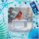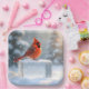 Auf einem durchsichtigen Eisblock, der von Schneeflocken umgeben ist, steht ein kräftiger roter Kardinal, der sanft vor einer verwischten Winterlandschaft fällt. Text auf Eisblock kann geändert werden.