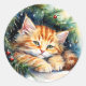 Das süße orangefarbene Kätzchen nimmt ein Nickerchen unter einem Weihnachtsbaumaufkleber.