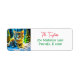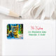 Hübsches kleines graues Kätzchen, das vor einem beleuchteten Weihnachtsbaum sitzt und im Schnee im Schnee Frohe Weihnachtsfeiertage Rücksendeadressen-Aufkleber spielt.