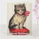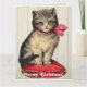 Dieses Design zeigt ein altes Bild eines Kätzchens, das auf einem roten Kissen sitzt und einen roten Bogen trägt.