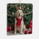 Ein Labrador Retriever, der Rentiere und einen roten Schal trägt, sitzt fröhlich vor einem verzierten Weihnachtsbaum. Text auf der Rückseite kann bearbeitet werden